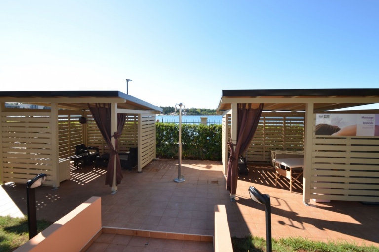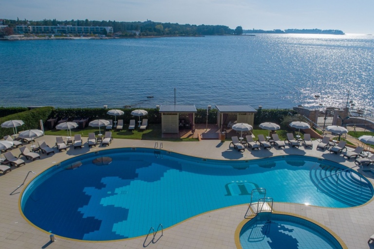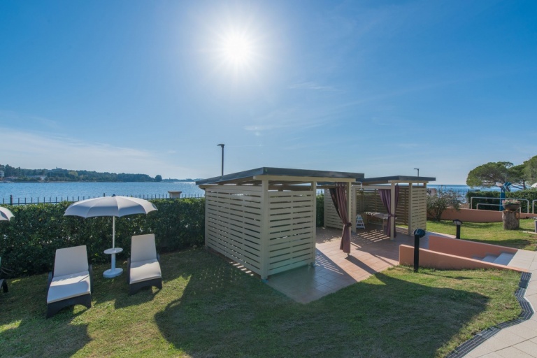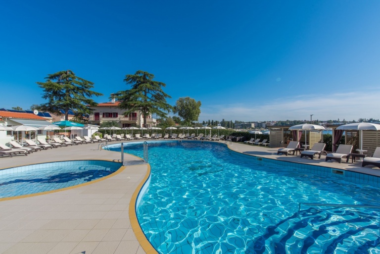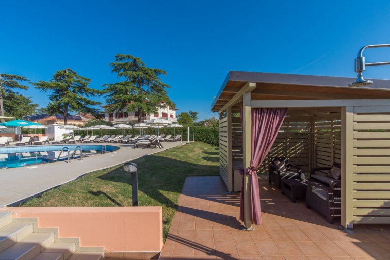 Next to the swimming pool, the large terrace is furnished with umbrellas and deckchairs. While sitting on one of the deckchairs, you can enjoy an extraordinary view of the bay and the town of Poreč.